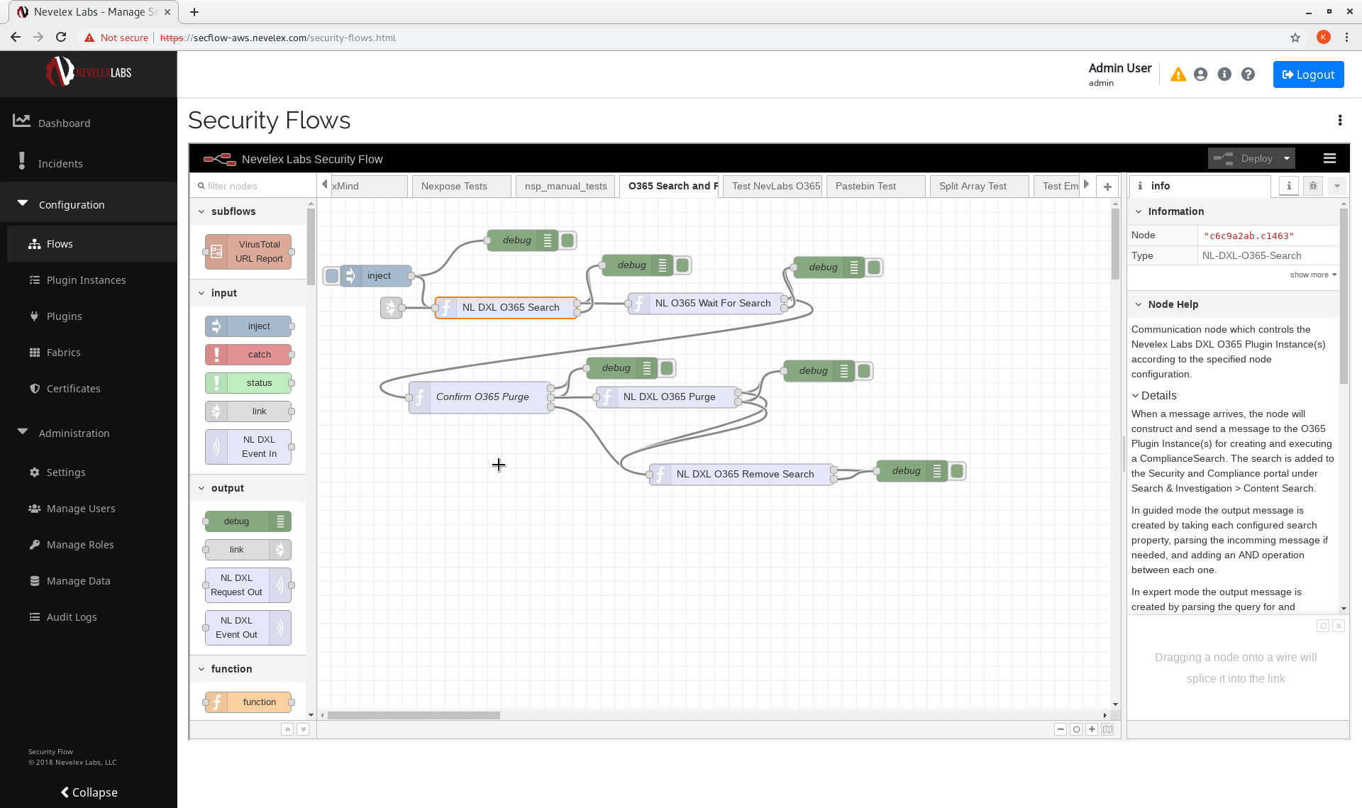 Seamlessly integrates security/IT products and services via a Plugin. Plugins provide a set of one or more Nodes used to perform updates or retrieve information from the product or service. Connect Nodes together to create a Flow for processing events.